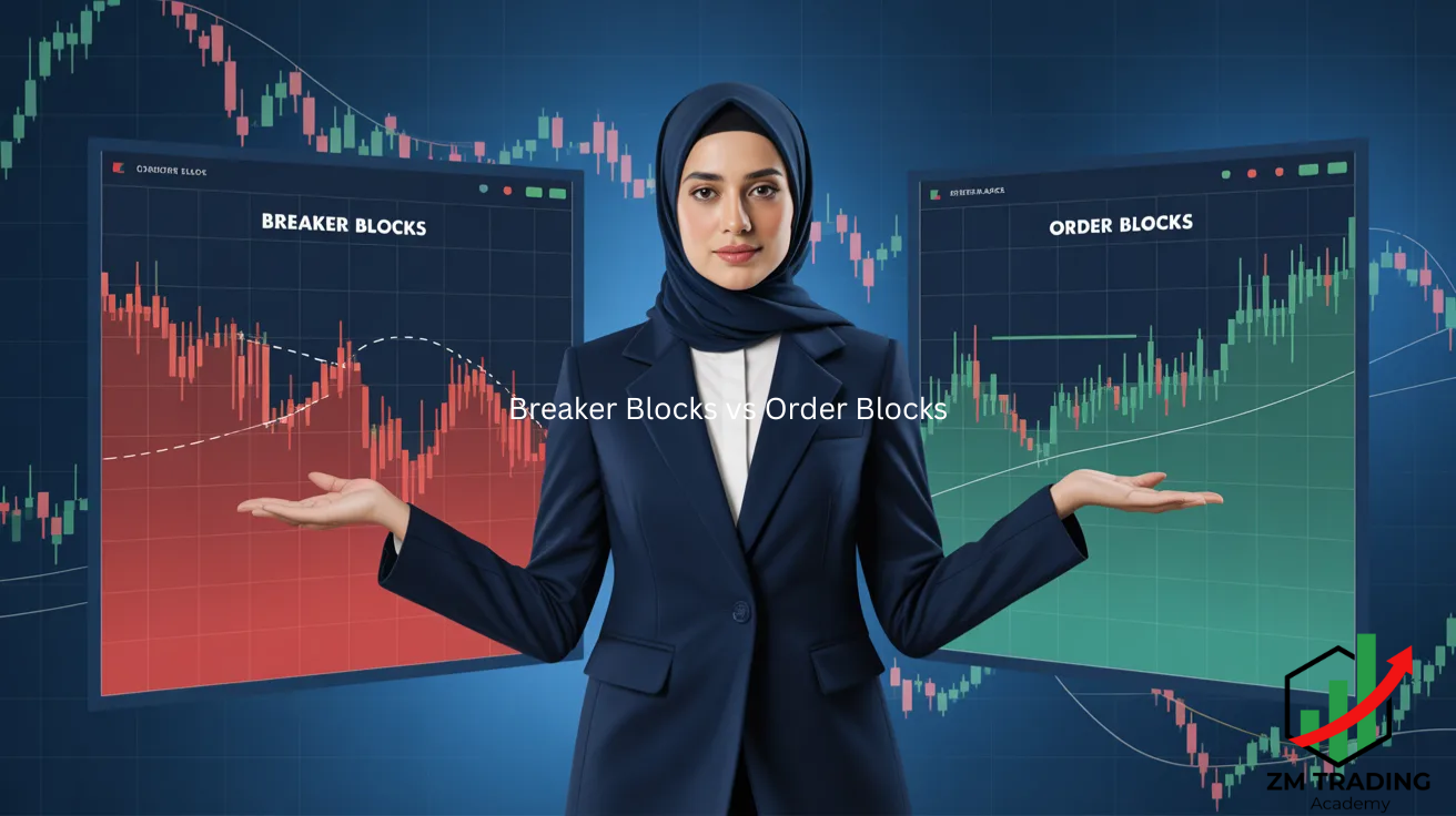 Learn the difference between Breaker Blocks and Order Blocks with real trading examples. Smart Money concepts for forex, crypto & stocks by ZMT Academy Pakistan.